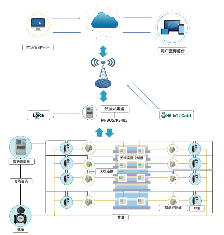 漢威供熱節能應用方案如下圖所示。該方案通過配置熱量表、智能控制閥、溫度控制器、采集器等多種儀表設備,在滿足“分戶循環、分室溫控、計量收費”的條件下,克服傳統供熱方案中單獨按計量收費、按時間收費、按面積收費等諸多弊端,采用計量溫控一體化法、通斷時間面積法、溫度面積法等多種供熱節能方法,有效解決智慧供熱中計量、收費和節能的平衡問題。不僅僅實現熱量計量自動化、用戶用熱自控化、系統調控智能化、平臺監管科學化,還能實現供熱系統的整體節能降耗,有效降低供熱單位的運營管理成本。